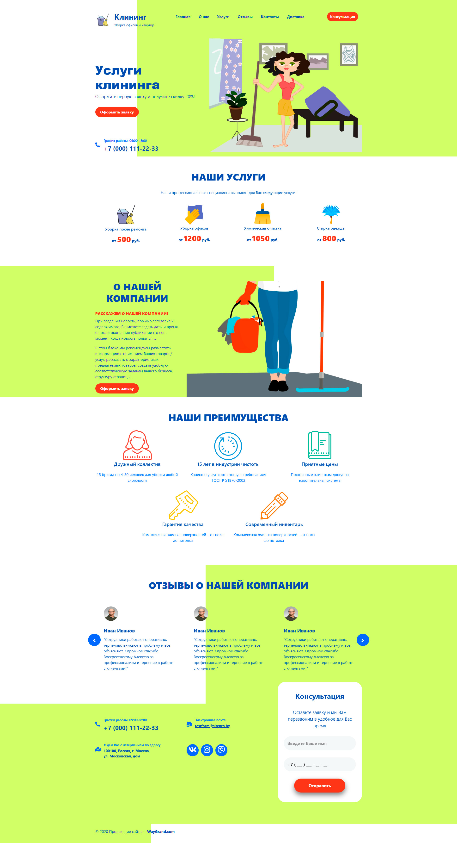 - Подвал с контактами и формой "Консультация"