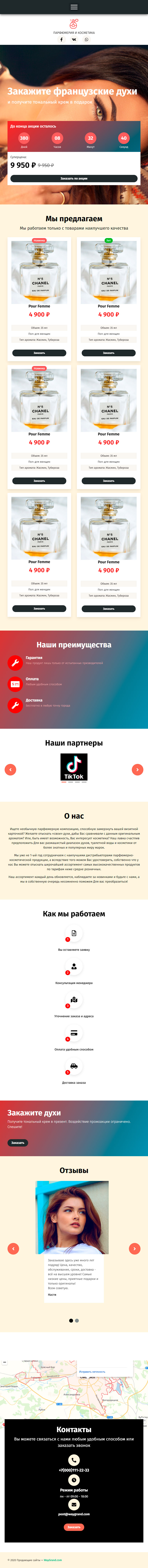 - Промоблок "Закажите французские духи" с кнопкой призыва к действию "Заказать по акции"