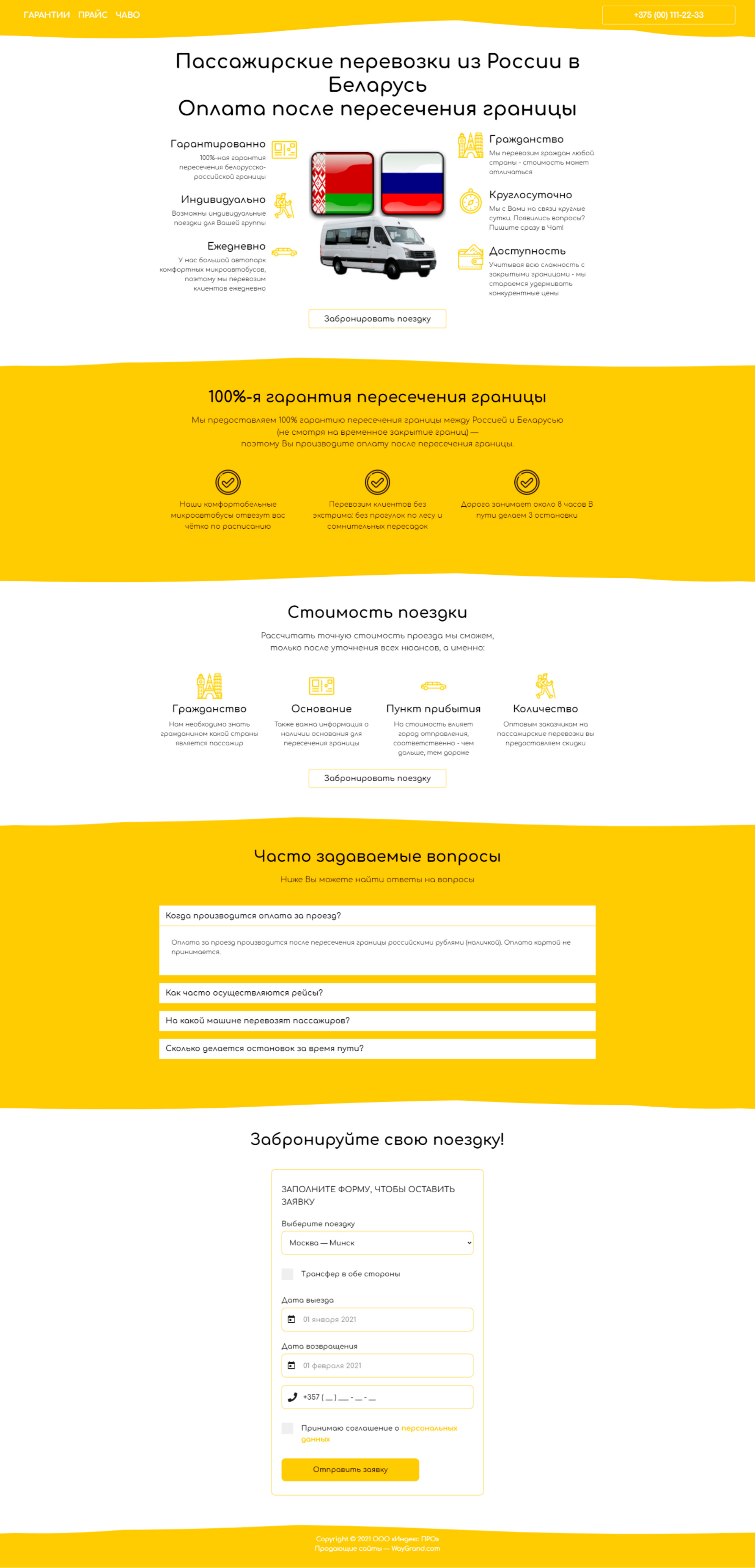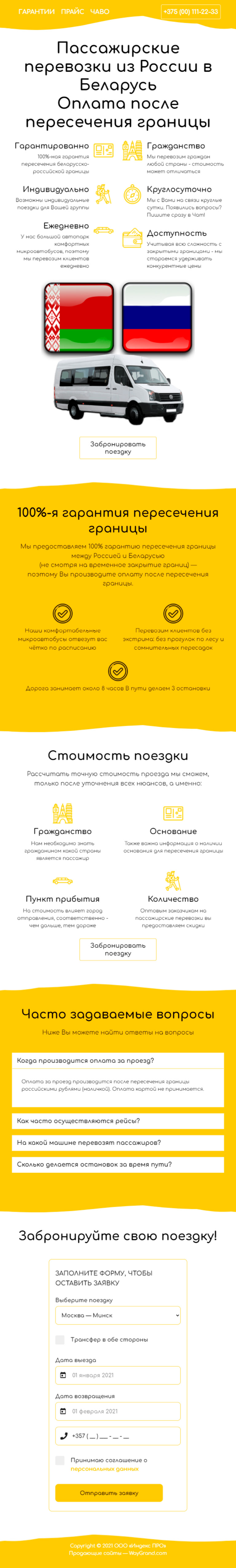 Закажите готовый продающий сайт лендинг #2528203 в за 1-3 дня «под ключ»: свёрстан, отрисован и готов к рекламе. Тематика шаблона «Пассажирские перевозки из России в Беларусь».