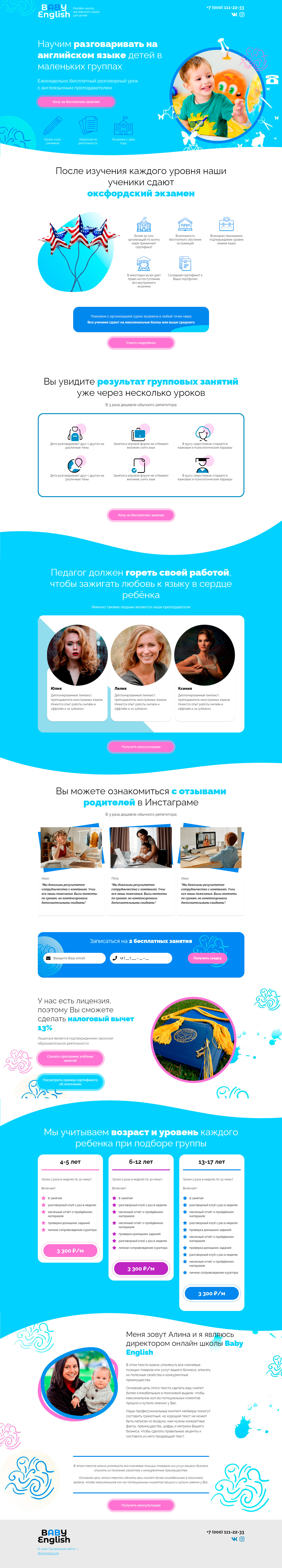 - Промоблок "Научим разговаривать на английском языке детей в маленьких группах" с кнопкой призыва к действию "Хочу на бесплатное занятие"