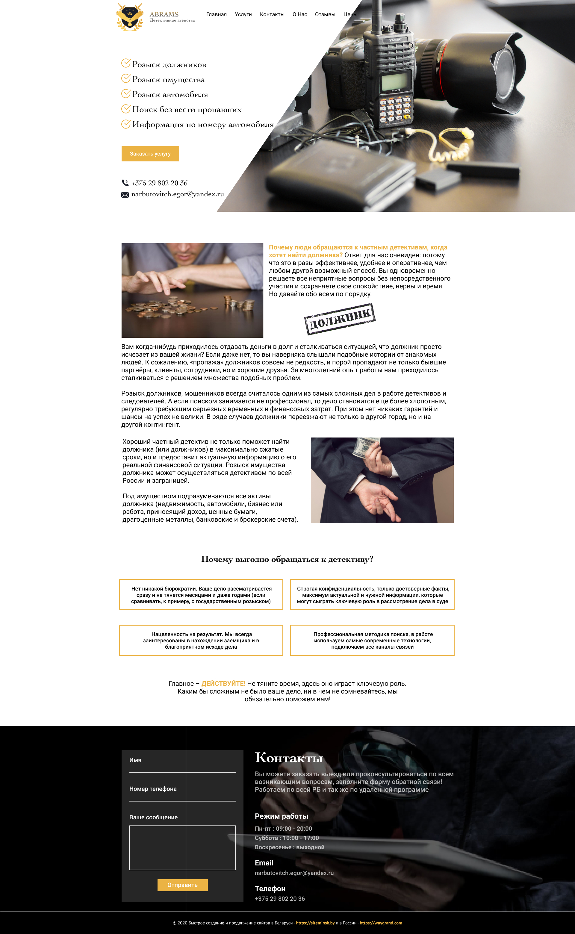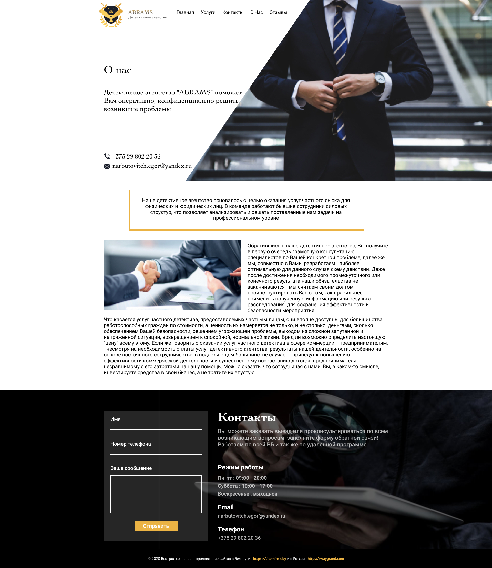 Закажите готовый продающий сайт визитка #239 в за 5-7 дня «под ключ»: свёрстан, отрисован и готов к рекламе. Тематика шаблона «Частное детективное агентство».